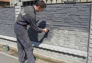 - Обычно такие краски выпускаются в белом цвете с возможностью дальнейшей колеровки. Анализируя, как покрасить бетонный забор под камень, стоит заранее выбрать оттенок, максимально повторяющий цвет природного материала.