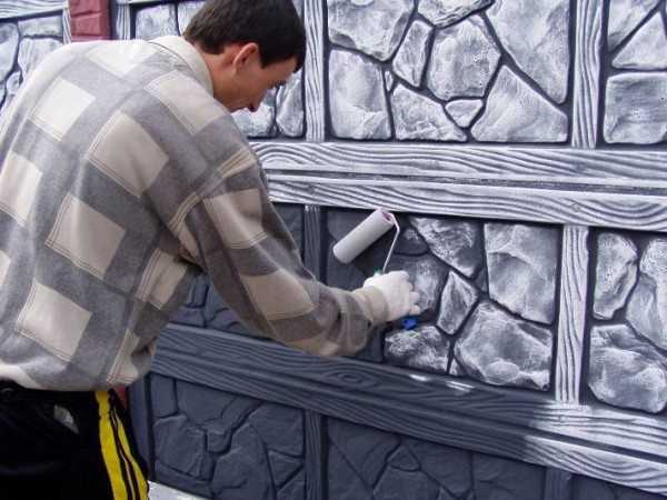 - Если планируется окраска «под камень», то по темной основе высветляем края элементов более светлым составом, используя валик или кисть с небольшим количеством краски.