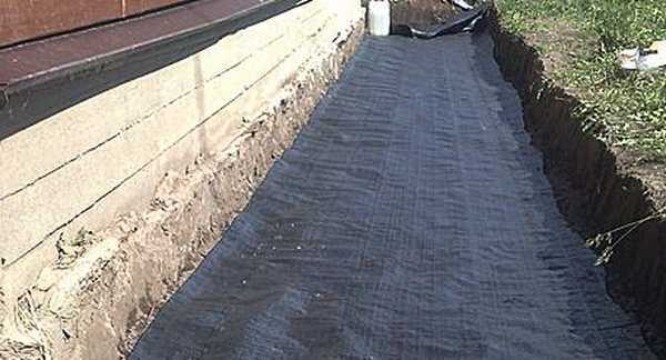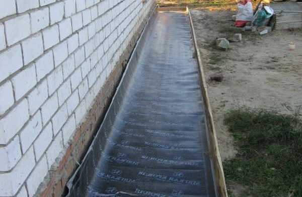 - Перед наполнением канавы для отмостки, нужно прежде застелить ее гидроизоляцией. Обязательно в таком случае должен быть наплыв на стены фундамента. Лучшими материалами для этой цели являются те, которые имеют в своей основе полипропилен. Подойдут и пленки из поливинилхлорида. Рубероид и полиэтиленовая пленка для этих целей практически не годятся.