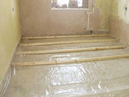Подготовленную поверхность застилают пароизоляционной пленкой, оставляя припуски 3-5 см на стены. Имеющиеся стыки обязательно проклеивают скотчем.