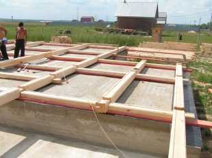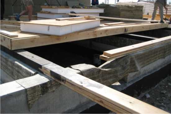 - По всему основанию в два слоя прокладывается рубероид. На нем размещается прокладочная доска. Утеплитель по площади должен превышать размеры фундамента и выступать за его края на четверть метра по всему периметру.