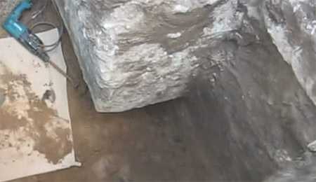 Когда быстрая усадка подтверждена, необходимо вырыть яму, имеющую наклон 35 градусов. Она делается рядом с самим фундаментом и продолжается до начала кладки бутового камня. После создания в яму вкладывается труба с диаметром 15-20 см, сделанная из асбестоцемента или металла. В нее льется цементный или бетонный раствор, до тех пор, пока земля им не насытится. После этого действия нужно остановить работу и в течение пары часов проследить за тем, впитывает ли земля остатки раствора. Если бетон все же уходит в землю, то яму снова наполняют через сутки.