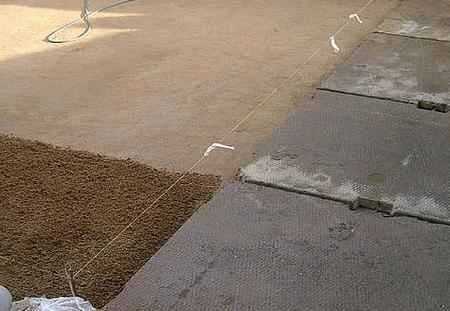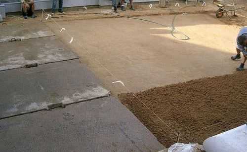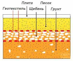 - Поверх геотекстиля насыпается десятисантиметровый слой щебня, а поверх щебня около 20 см песка.