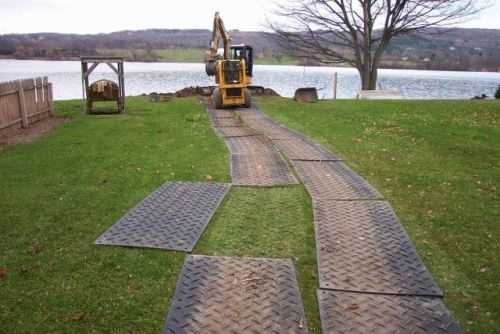 Важно! Первый совет: если дорога сооружается для постоянного использования, то следует задуматься об обустройстве дренажа (для этого тоже понадобится экскаватор). Второй совет: ни в коем случае нельзя производить укладку дорожных плит прямо на грунт. Это чревато тем, что впоследствии они просядут, и дорога будет разрушена.