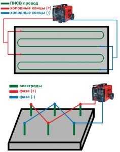 В зависимости от вида и геометрии конструкции используются различные электроды для прогрева бетона. Для каждого из них разрабатывается своя схема подключения:
