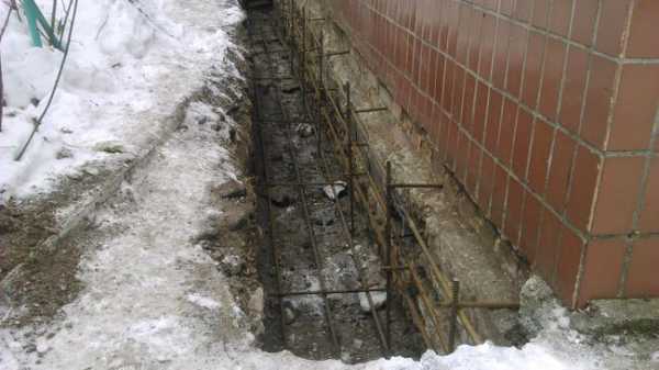 Отличием в технологии является жесткая привязка собранного металлического каркаса к основанию фундаментной стены. Для этого в ней необходимо сделать отверстия и вбить в них армирующие прутья, после чего прихватить к ним уложенный в опалубку каркас с помощью электросварки. Подобная трудоемкая, но действенная технология позволяет придать укрепленному фундаменту иные характеристики, усилив его несущую способность, чтобы сделать его дальнейшую усадку невозможной.