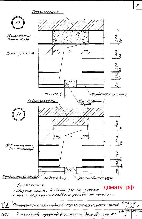 10. В стенах подвала над проемами шириной не более 600 мм укладываются фундаментные блоки (серия 2.110-1 выпуск 4 деталь 8, 12) или монолитный бетон кл. В 10 армированный арматурой А- I диаметром 10 мм из расчета 1 стержень на 120 мм толщины стены с опиранием по 250 мм (серия 2.110-1 выпуск 4 деталь 9). Над проемами шириной более 600 мм укладывать перемычки (серия 2.110-1 выпуск 4 деталь 11).