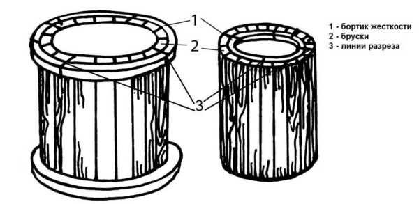 Из бруска нарезаете куски по 20-25 см длиной. Их крепите под бортик сверлите отверстие в металле, прикручиваете на саморезы отрезки брусков. При длине брусков в 20-25 см форма получится не круглой, а многогранной. Если для вас это критично, можно сделать надрезы чаще, короче напилить бруски. Укрепить также надо высоту. Для этого тоже используют бруски. Крепить их надо почаще — чтобы стенки не прогибались.