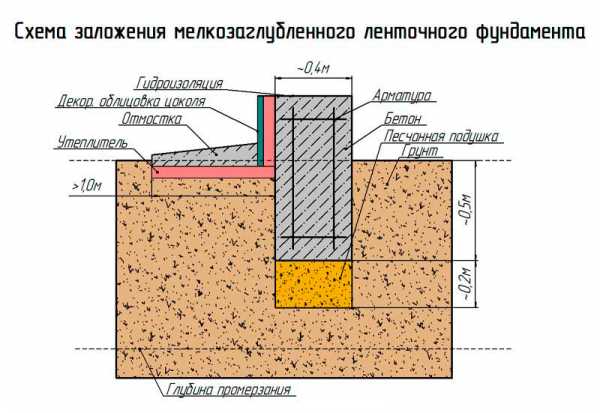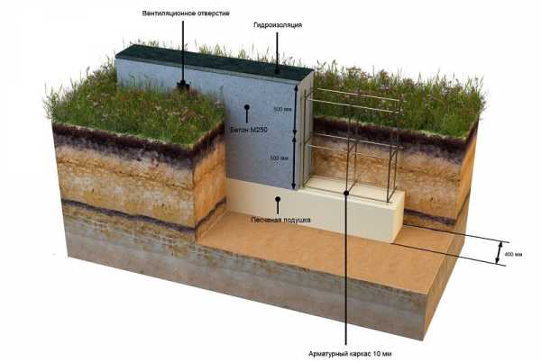 Основное требование к ЛФ – нивелировать воздействие пучинистых грунтов, что достигается созданием песчано-щебневой подушки. В зависимости от глубины закладки существуют два типа ленточных фундаментов:
