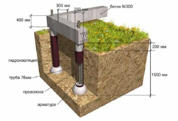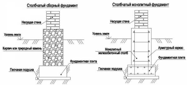 На практике реализуется два варианта – сборный столбчатый и монолитный фундамент на столбах. При заливке столбов необходимо сразу предусмотреть систему дренажа самого основания, цоколя и опалубки для защиты от грунтовой влаги.