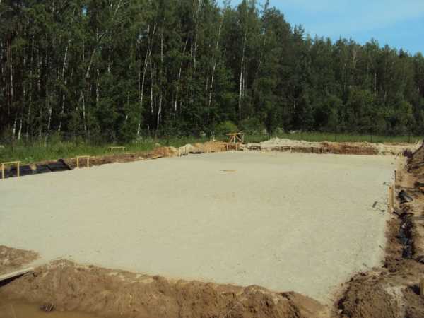 Основание из ж/б плитПреимущество использования плит – скорость строительства, несмотря на трудоемкость земляных работ. Обустройство котлована включает в себя несколько этапов: создание песчано-щебневой подушки, трамбование и создание бетонной подушки между песчано-щебневой прослойкой слоем гидроизоляции.