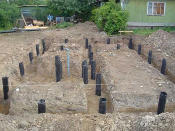 Ямы роются (бурятся) по периметру будущего строения и в тех местах, где будут находиться несущие стены. Углубляться в грунт следует ниже места его промерзания примерно на 30 сантиметров и еще около — 20 прибавлять под будущую подушку.