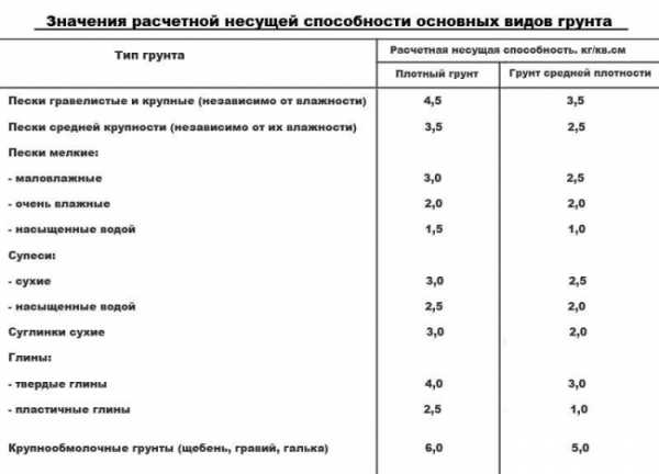Для того чтобы правильно рассчитать несущую способность фундамента, нужно знать тот тип грунта, на котором производится строительство. Большая несущая способность у каменистых грунтов и скальных пород, супеси и пески имеет минимальные показатели несущей способности.