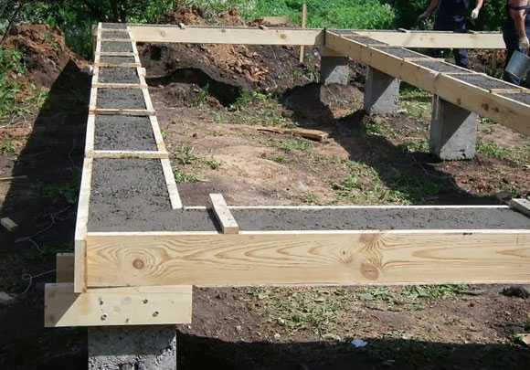 От выбора столбчатого или буронабивного варианта — зависит технология свайно-ростверкового фундамента.Но обе они включают предварительную расчистку площадки и разметку ям (в этих местах плодородный слой снимается на 20 — 25 сантиметров). Ориентиром высоты станут натянутые на колышки веревки; натягиваются они по ширине ростверка.
