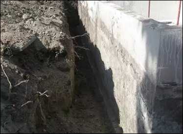 Расстояние между фундаментом и рвом лучше всего заполнять глиной, потому как глина плохо пропускает воду и является природным консервантом. Только необходимо как следует утрамбовать.