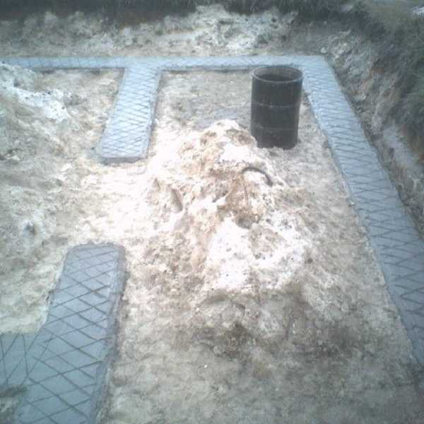 - залить монолитный увеличенный «абрис» блочного фундамента, не забыв расширить его с внешней и внутренней стороны на 10-20 см. Подошва-подготовка должна быть шире! В зависимости от прочностных характеристик подстилающих пород высота данной опорной ленты может варьировать от 10 до 30 см. Для укрепления ее снабжают тремя-пятью рядами арматурного прутка;