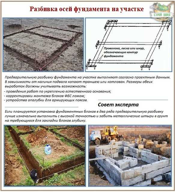 Так как перед рытьем котлована или траншеи наверняка производилась разбивка без особой скрупулезности, хозяину обязательно нужно проследить, чтобы подобная халатность не была допущена при переносе осей фундамента на подготовленную основу: