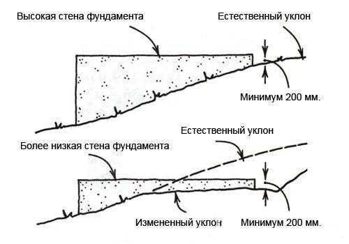При перепаде высот более 20 см начинать разработку траншеи под фундамент с наивысшей части площадки было бы неверно, так как в этом случае подошва фундамента в самой нижней точке может оказаться на поверхности грунта или даже выше. За базовый уровень, от которого следует отталкиваться, принимают наиболее низинную часть участка.