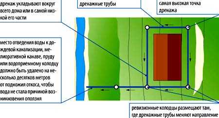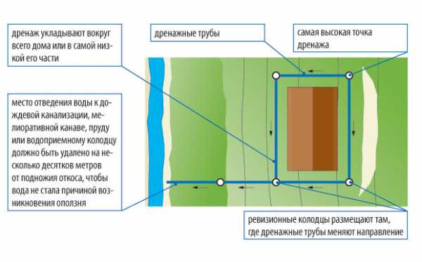 - дренаж – так как вся влага стекает вниз по склону, то она способна вымывать почву и даже подмыть основание дома. Устройство ливневой и дренажной канализации поможет направить стоки в сторону от строения;