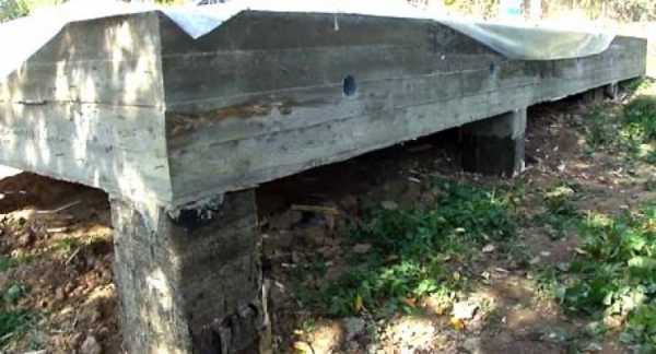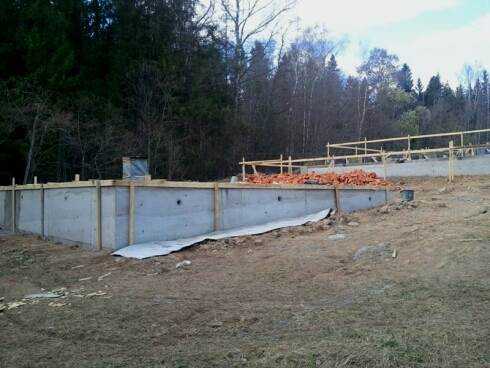 - Для полного застывания и усадки фундамента отводится примерно месяц, после по уклону под нижней стенкой сооружают опорную насыпь для выравнивания разницы высот.
