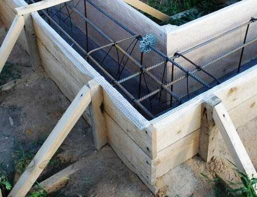 Ленточный фундамент устраивается из высококачественного бетона с обязательным армированием. Возводить данный тип основания лучше всего на почвах, не предрасположенных к пучинистости и заболачиванию. При необходимости на участках с небольшим уклоном проводят подсыпание грунта для выравнивания части склона, выделенной для фундамента.