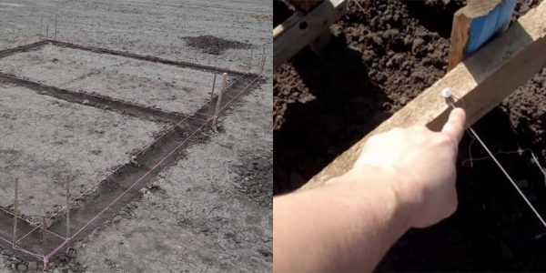 Дополнительно для обозначения периметра между стержнями протягивают прочный капроновый шнур и обвязывают им угловые колышки. Углубления для столбиков фундамента должны располагаться в углах строения, в местах соединения внешних стен с перегородками и по периметру. В нашем случае достаточно будет угловых, стыковочных столбиков и одного посередине перегородки.