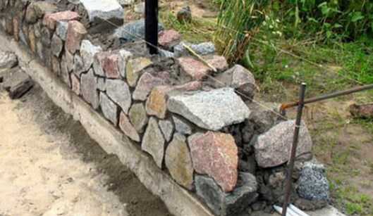 - Каменное основание, которое не понадобится углублять в землю. Из больших валунов, металлических прутьев для крепежа и строительной смеси понадобится собрать каменный пояс шириной и высотой менее 1 м. Над ним можно будет устанавливать ограждение.