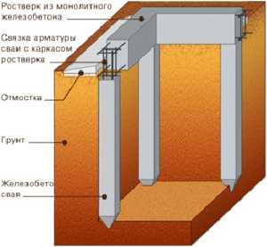 Фундамент из свай состоит так же из ростверка – это ленточная конструкция очерчивающая контур фундамента и скрепляющая сваи между собой.