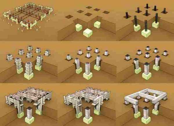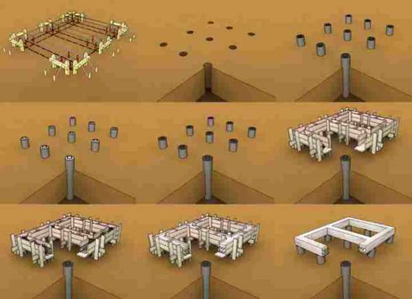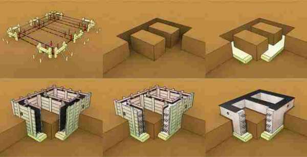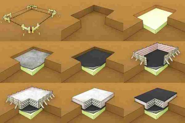 Возведение монолитного железобетонного фундамента включает следующие этапы: