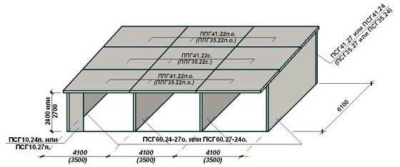 Типовая схема железобетонного гаража представлена на рисунке. Наиболее простой вариант сборной коробки состоит из стеновых плит, основания, задней и передней стенки и навесного козырька над входом в помещение. Из схемы становится понятно, что производители сборных гаражных конструкций ориентировались, прежде всего, на стандартный размер помещения 6х4 м с потолками 2,45- 2,6 м.