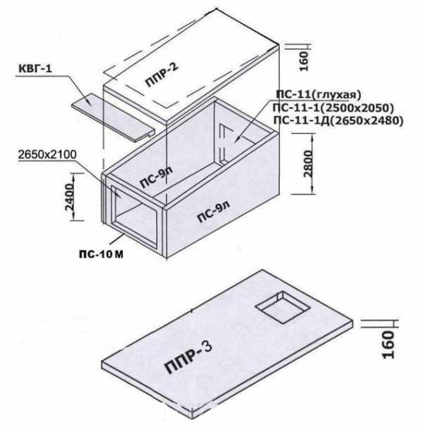 Можно купить самый дешевый сборный вариант без бетонной плиты пола — модель ЖБИ-1, или с бетонным основанием, и даже сборный комплект ЖБИ-3 с подвальным помещением или смотровой ямой. В этом случае потребуется выкопать фундамент и установить на бетонной стяжке плитные стены и перекрытие подвала. Понятно, что разбирать такую сборную конструкцию будет достаточно сложно.