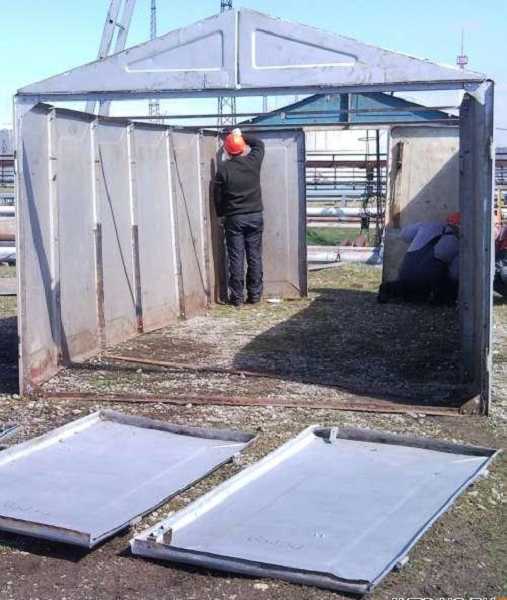 Конструкция панельного сборного бокса не имеет самостоятельного внутреннего каркаса или силовых трубчатых балок, на которые навешивались бы металлические листы облицовки стен или крыши. Жесткость сборной коробки обеспечивается за счет толстой профилированной панели из штампованного стального листа. Бортики по периметру панели имеют отверстия, через которые несколько стальных секций собираются болтовым соединением в готовую конструкцию стены. Устройство и способ сборки хорошо проиллюстрированы на фото.