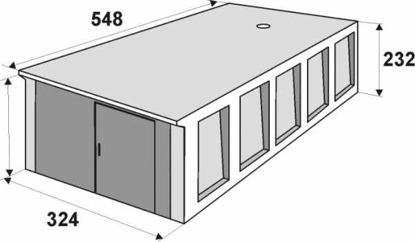 - ЖБИ-1 – сборный гараж, конструкция которого имеет такие размеры: высота – 232 см, ширина – 324 см, длина – 548 см. Вес постройки – 15 тонн. В комплектации присутствуют плиты из железобетона, из которых и формируется гараж. Как именно выглядит конструкция, видно на фото.