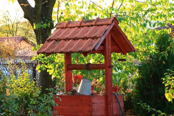 Над колодцем часто делают домик. В большинстве случаев его функция исключительно декоративная. Но устройство крыши над колодцем имеет и большее значение, нежели просто элемент дизайна участка. Навес должен выполнять ту же роль, что и крыша дома — защищать от попадания осадков внутрь. Поэтому стоит сделать скаты пошире, так чтобы текущая по ним вода падала на землю как можно дальше от колодца.