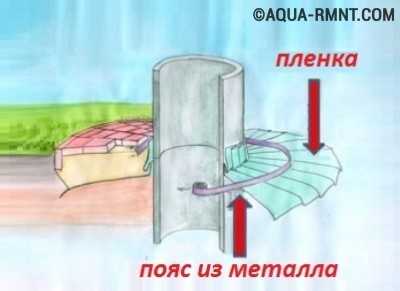 Пленка хорошо прижимается к колодцу, она не должна сползать. Для этого металлической лентой оборачивается стенка первого кольца, и крепко придавливается пленка.- Крепление осуществляется шурупами непосредственно к бетону. Задачу можно упростить: вокруг кольца пленку можно зафиксировать скотчем, обмотав его несколько раз. Но в этом случае необходимо место оклейки закрыть декоративным материалом.