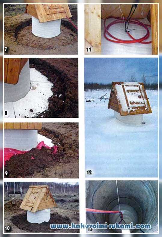 Если из колодезного источника идет в частный дом водопроводная труба, ее также следует изолировать замком, не зависимо от глубины ее укладки. Можно глину сверху накрыть геотекстилем, положив на него сверху булыжник или тротуарную плитку.