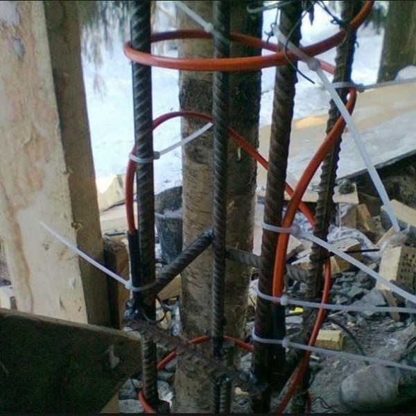 4. Нагревательный элемент крепится непосредственно к армируемой конструкции с помощью обычных кабельных стяжек. Не допускается крепление вязальной проволокой, во-избежании повреждения греющего элемента.
