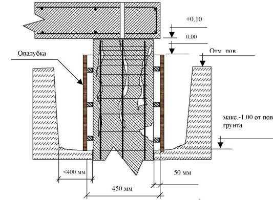 В армированную опалубку бетонная смесь заливается постепенно. Каждый бетонный слой должен быть толщиной не более 15-20 см, при этом он должен тщательно утрамбовываться, чтобы не оставалось пустот. Чтобы избежать эффекта слоености, бетонная смесь во всех слоях должна быть одной и той же консистенции. Через 7-10 дней бетон наберет достаточную прочность, тогда опалубку можно будет снять. После этого производится песочная засыпка всех пазух между землей и фундаментом, а верхняя поверхность готовой железобетонной конструкции покрывается гидроизоляционным материалом.