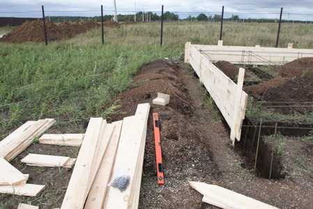 Для ленточного фундамента сборка опалубки начинается с выбора самого практичного материала. Самый практичный материал #8212; это доска. Доску лучше выбирать из сосны или ели. Эти две породы наиболее подходят для строительства опалубки. Для качественной установки нужно вбить деревянные бруски строго по проекту, на них будут опираться основные части. Закреплять эту конструкцию следует гвоздями. По всему периметру через каждые 40- 60 см. нужно будет скрепить доски проволокой, а через каждый метр подпереть доски еще досками. Обязательно нужно проверить всю опалубку уровнем. чтобы исключить любые отклонения.