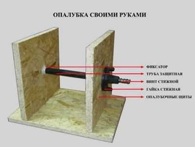 - через предварительно просверленные отверстия в опалубке и трубу продевается шпилька, на резьбовые концы которой навинчиваются гайки;