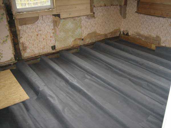 - После подготовки старой деревянной поверхности, на нее укладывается пленка в качестве гидроизоляционного слоя. Края пленки должны находить на стены, чуть выше уровня стяжки.