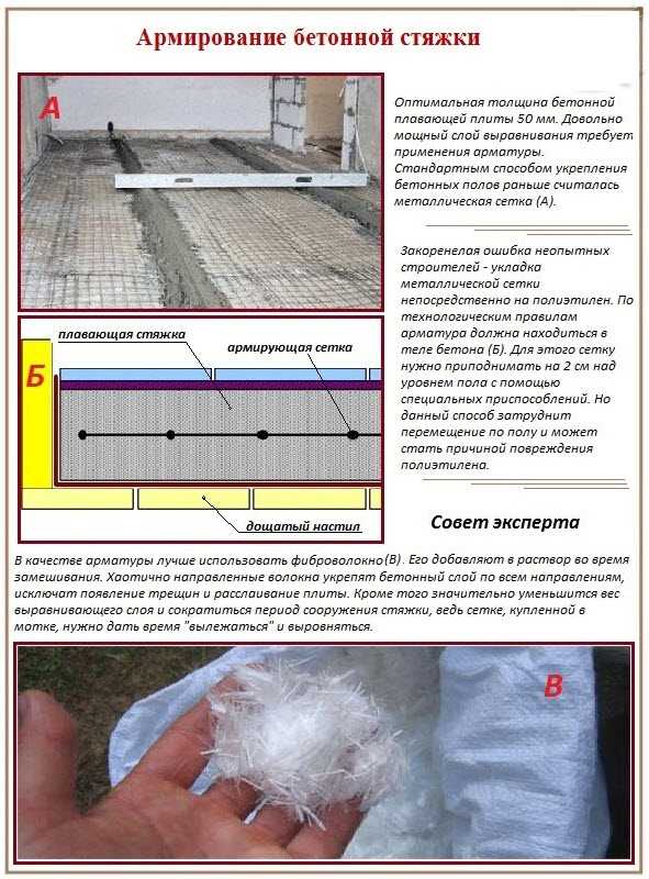 Произведение армирования является обязательным условием для стяжки на деревянном полу, применение классической армирующей сетки нежелательно, так как она дополнительно утяжеляет конструкцию. В этом случае можно применять микрофибру.