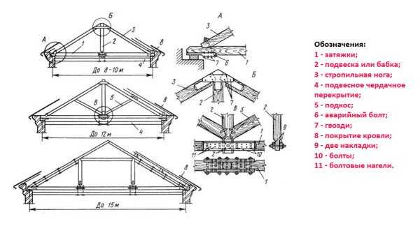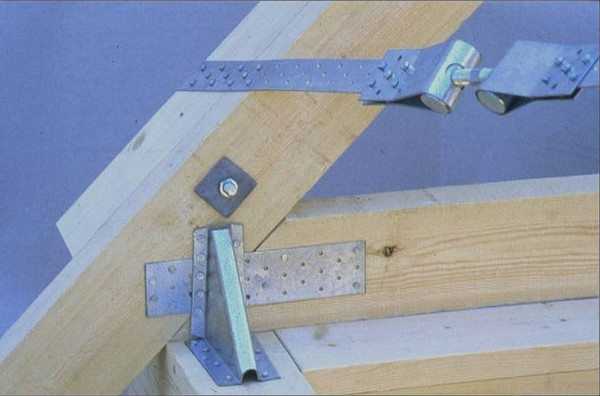 Обычно такие соединения бруса представляют собой косой скос под 45 градусов, который фиксируют к поверхности при помощи больших гвоздей. Также для усиления и повышения прочности используют металлические скобы. Верхушки стропила собирают на болтовых соединениях, а между собой связывают досками или листами фанеры.