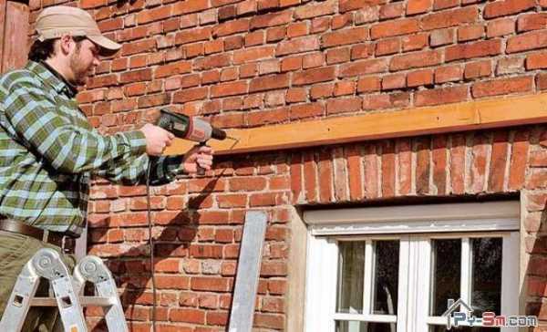 Если стена дома выложена из кирпича, следует применить несколько другую технологию монтажа. Для этого на расстоянии по бруску просверливаем отверстия сверлом по дереву, далее сверло меняем на победитовое. Приложив рейку к стене, через просверленные дырки выполняем разметку, надсверливая кирпич.