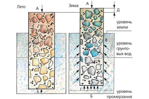 В зимний период может наблюдаться увеличение объёма грунта в результате перехода воды в твёрдое состояние.