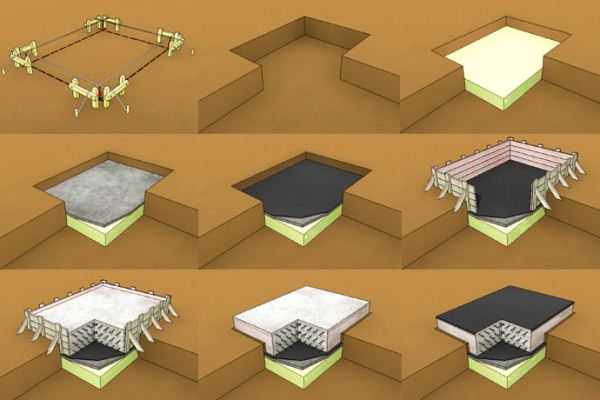Порядок действий при строительстве плитного фундамента следующий: