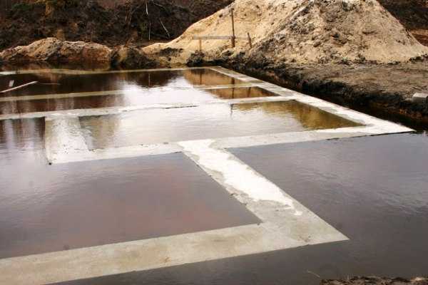 Если они находятся на глубине, не превышающей один метр, используют плитный фундамент. В случае более глубокого размещения подземных вод применяют ленточное основание.