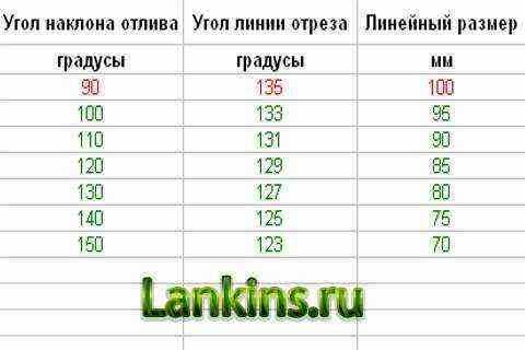 Есть таблица соотношения углов наклона отлива и углов линии отреза отлива, правда только для самого распространенного размера отлива шириной 100 мм. Также, в таблице указаны значения, с помощью которых можно делать более точную разметку без использования угломера.
