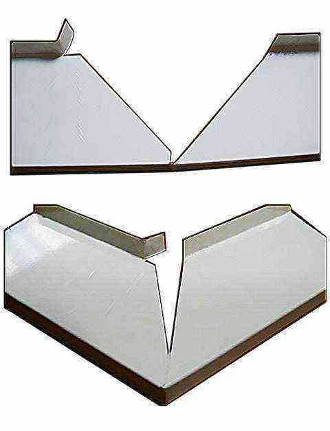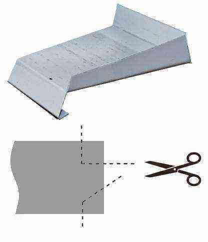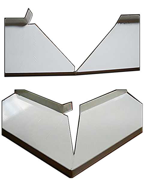 - Из одного прямого отлива. Это более простой способ. Берется один прямой отлив. В его середине размечается угол 90°. При этом вершина угла должна быть на нижней полке, а на одной из сторон должны быть припуск до 20 мм. После этого отлив режется по линиям разметки. Нижняя полка не режется. Далее деталь загибается, чтобы между ее частями получился прямой угол, а припуск оказался снизу стыка. Две части соединяются заклепками или пайкой.