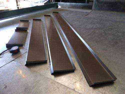 - Возьмите ножницы по металлу и вырежьте нужные заготовки из подготовленных металлических листов. Их ширина должна быть больше примерно на 20 мм, чтобы хватило места на загибы. Сделать его можно положив отлив на угол и загибать с помощью молотка, периодически по нему постукивая.